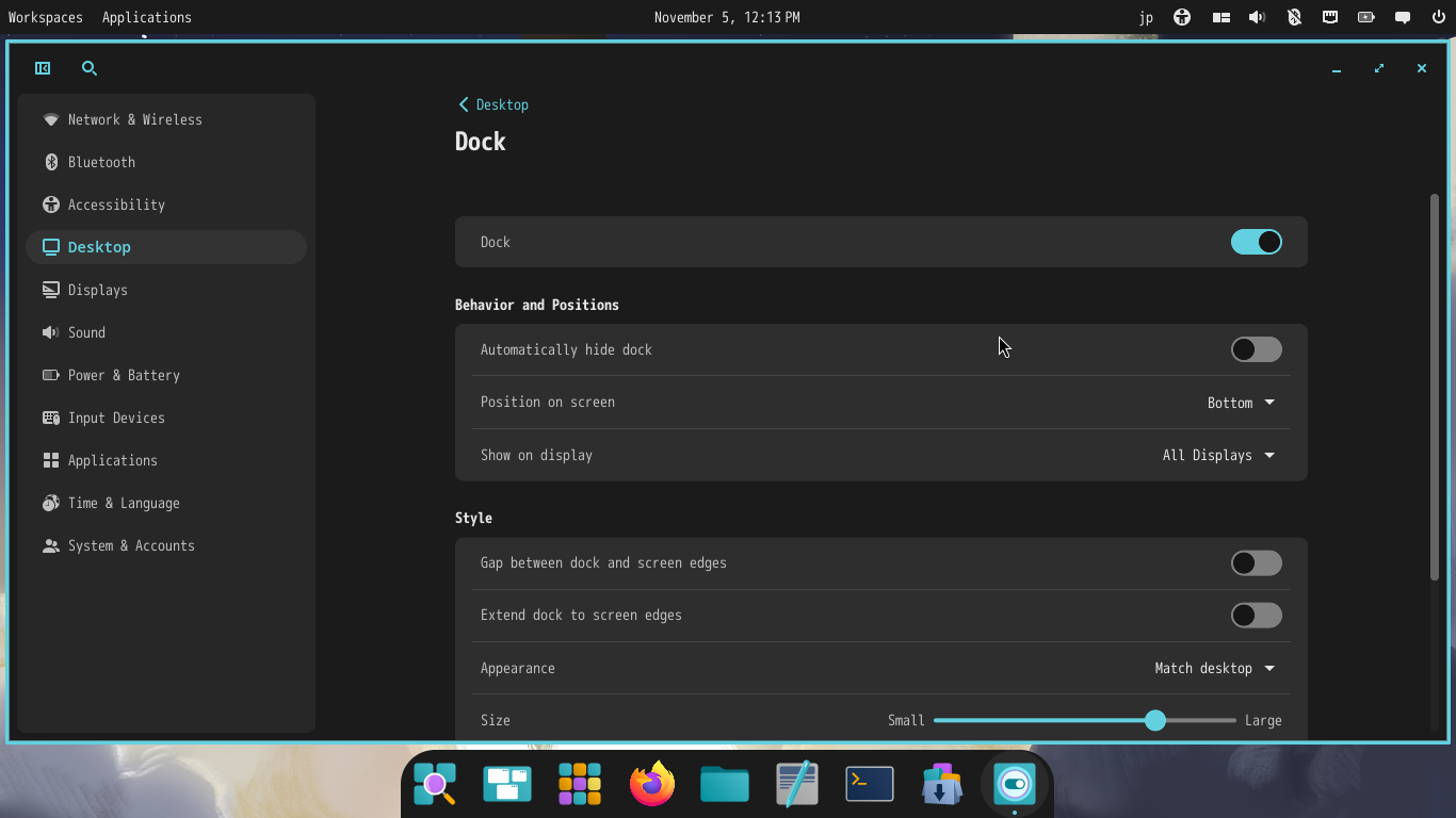 1. 概要 ドックに関する設定について、記述します。 2. 設定 設定画面で。 「Desktop」タブ。 「Dock」で設定します。