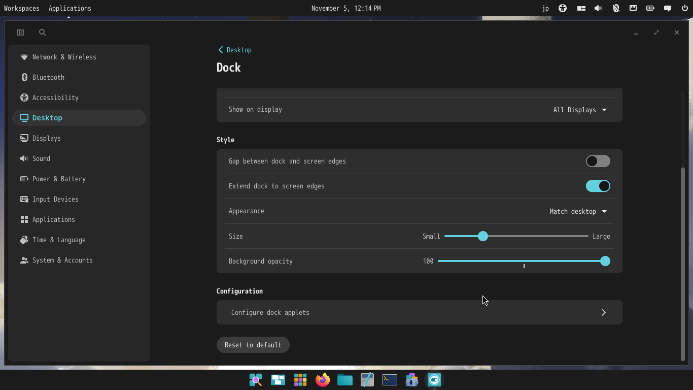 「Extend dock to screen edge」をチェックすると、横一杯に広がります。