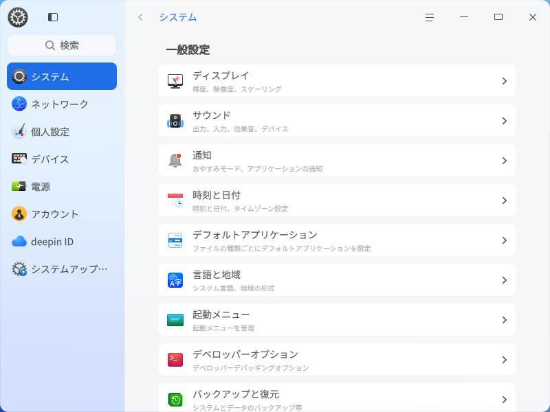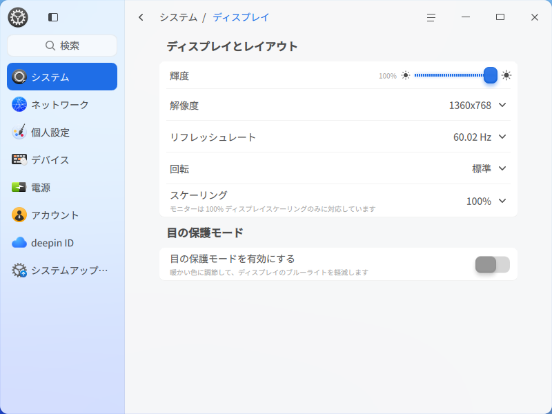 1. 概要 以下、「deepin 25.0.10」での操作です。 ずいぶん、画面の様相が変わっています。 2. 設定 「設定」を開いて。 「システム」タブ、「一般設定」「ディスプレイ」