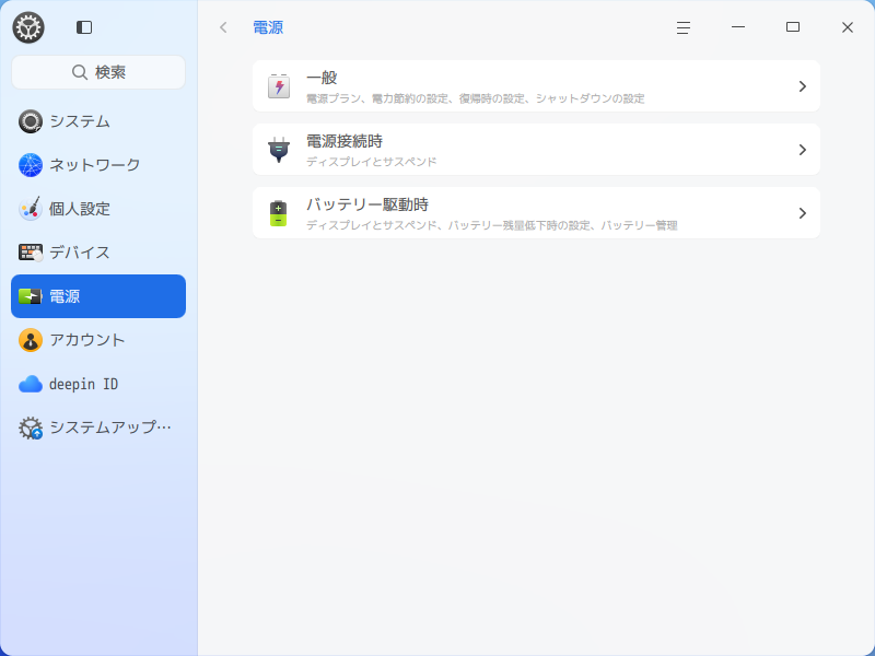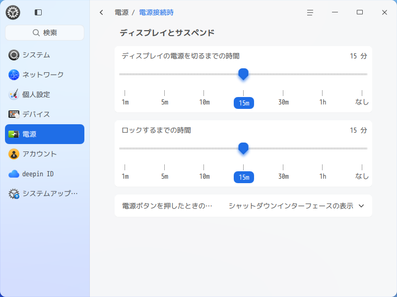 1. 概要 「deepin 25.0.10」では、前ページに加えて設定が必要です。 以下、「deepin 25.0.10」の画像です。 2. 設定 前ページと同様、スクリーンセーバの設定を行ったうえで。 「電源」タブ、「電源接続時」