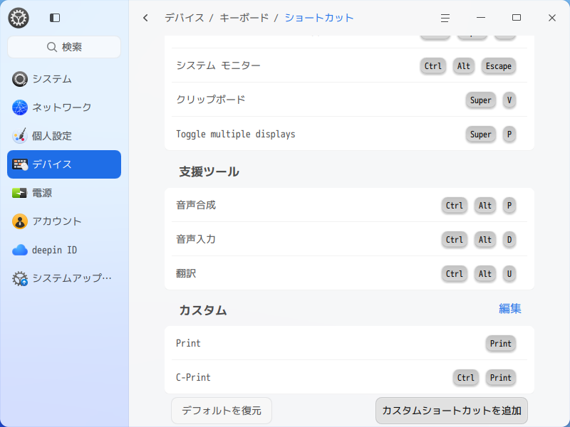 キーボードショートカットの設定に関して、「画面キャプチャ」に書いておるのですが、そこで設定している画像が「deepin 25.0.10」では、異なっておるので、改めて書きおこします。