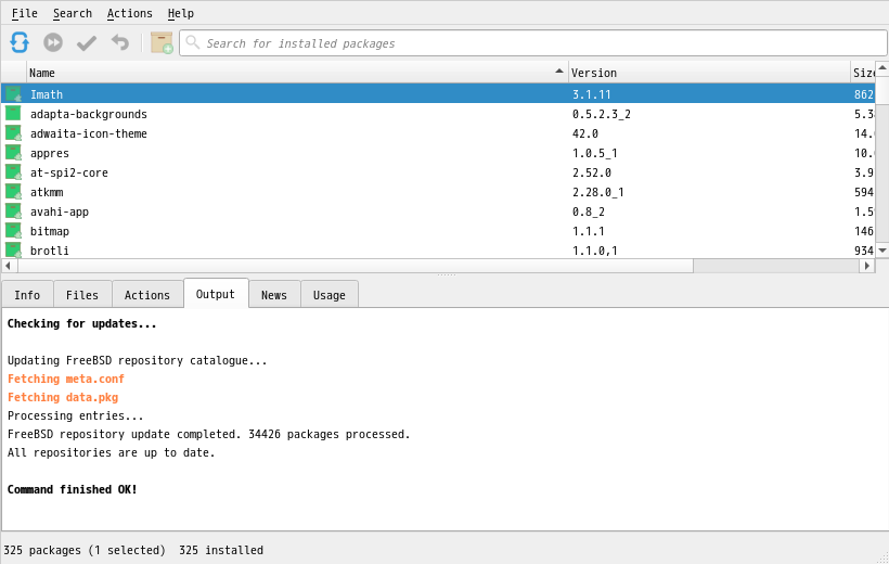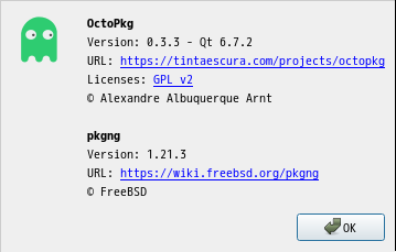 1. 概要 「OctoPkg」は、パッケージ管理(pkg)のグラフィカルフロントエンドです。 基本的な操作については共通事項の「パッケージ管理 OctoPkg」を参照してください。 2. インストール 「OctoPkg」自体は、コマンドでインストールします。 「root」ユーザ権限で。 pkg install -y octopkg 3. 起動 「スタート」→「システム」→「OctoPkg」