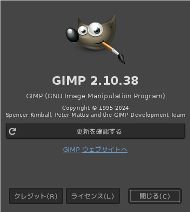 起動直後の状態です。 2024年9月30日の時点で、下記のバージョンでした。 操作については、「画像編集ソフト GIMP2」に掲載しています。 上記は簡単なものですので、詳細なものがほしい方は、各所に初歩の手引きから応用編までありますので、そちらを参考にしてください。 |
