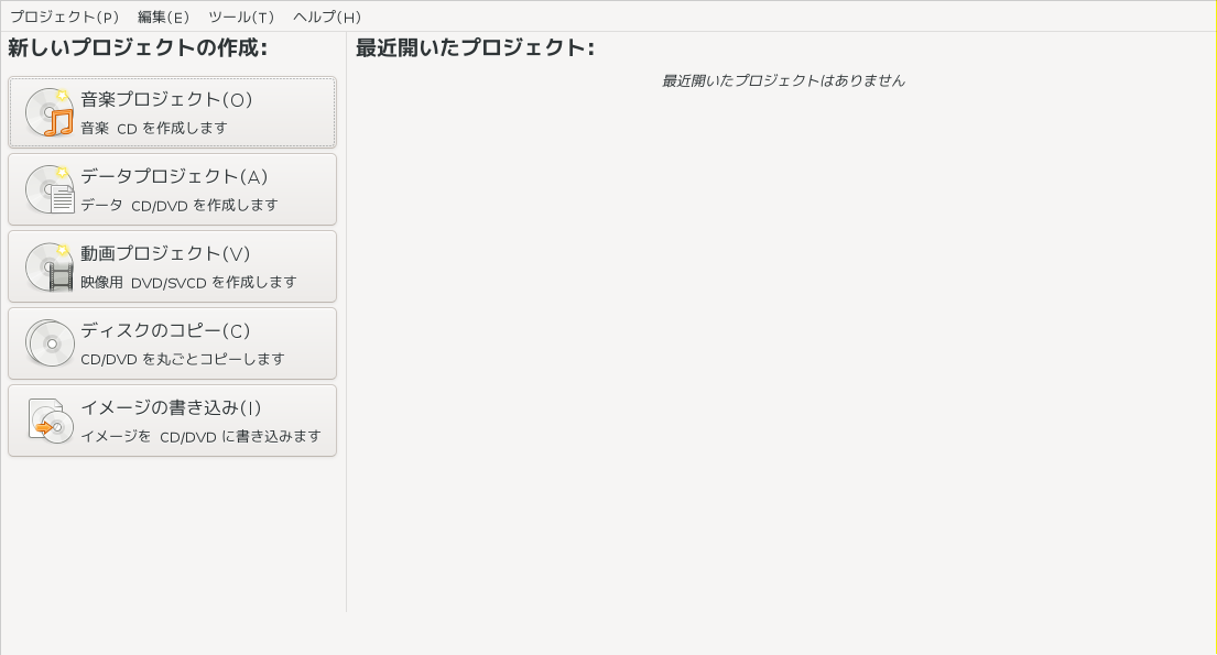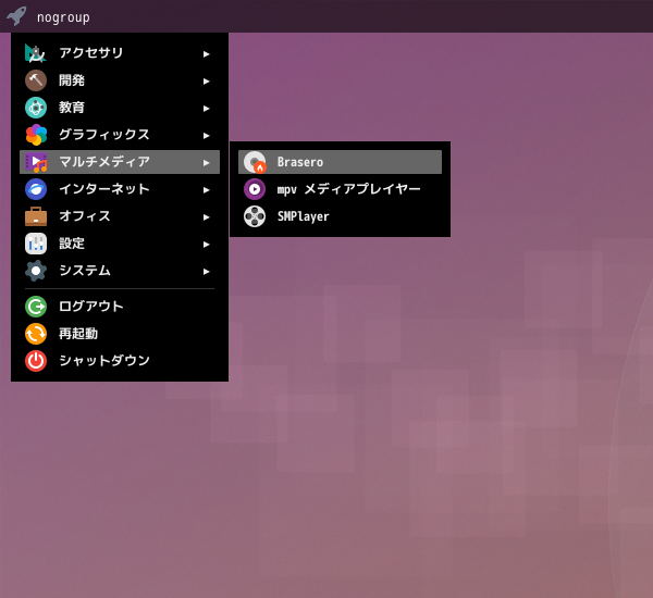 1. 概要 「Brasero」は、光学ディスク(CD・DVD)のライティングソフトです。 基本的な操作については「共通事項 - 光ディスクライティング」をご参照ください。 2. インストール 「OctoPkg」で、「brasero」を検索して、インストールします。 3. 起動 「スタート」→「マルチメディア」→「Brasero」