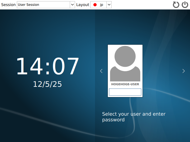 ログイン画面の解像度を「1366x768」とし、キーボードレイアウトを「jp.106」にします。