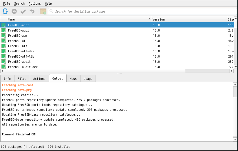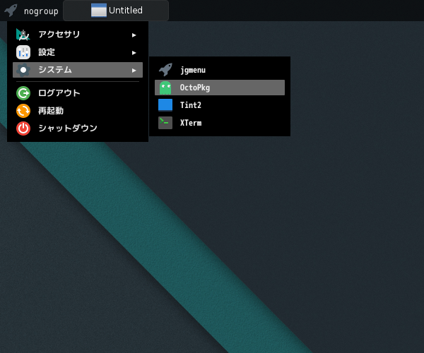 1. 概要 「OctoPkg」は、パッケージ管理(pkg)のグラフィカルフロントエンドです。 基本的な操作については共通事項の「パッケージ管理 OctoPkg」を参照してください。 2. インストール 「OctoPkg」自体は、コマンドでインストールします。 「root」ユーザ権限で。 pkg install -y octopkg 3. 起動 「スタート」→「システム」→「OctoPkg」