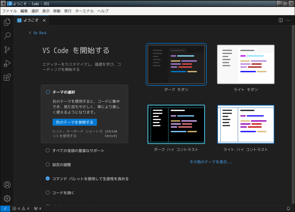 日本語化後に、起動した直後の状態です。 2024年10月17日の時点で、下記のバージョンでした。 「Visual Studio Code」の操作等については「統合開発環境 Visual Studio Code」をご参照ください。 |