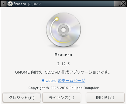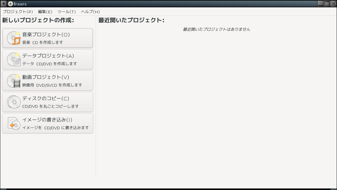 1. 概要 「Brasero」は、光学ディスク(CD・DVD)のライティングソフトです。 2. インストール 「OctoPkg」で、「brasero」を検索して、インストールします。 3. 起動 「スタート」→「マルチメディア」→「Brasero」