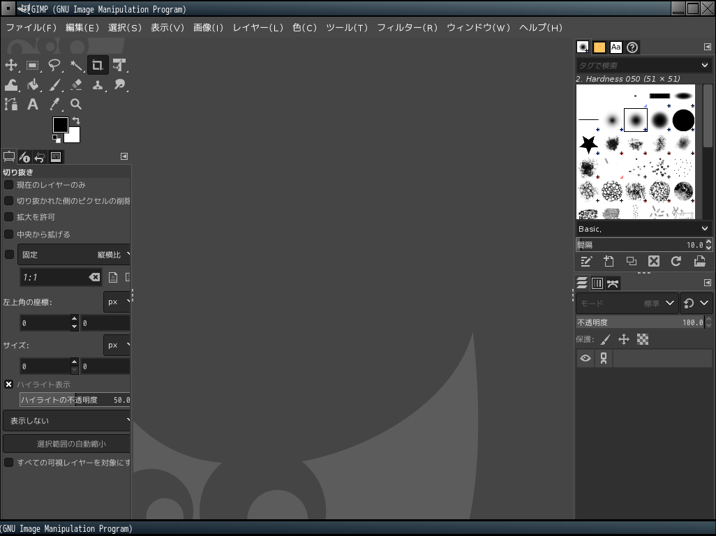 起動後の状態です。 2025年3月21日の時点で、下記のバージョンでした。 操作については、「画像編集ソフト GIMP2」に掲載しています。 上記は簡単なものですので、詳細なものがほしい方は、各所に初歩の手引きから応用編までありますので、そちらを参考にしてください。 |