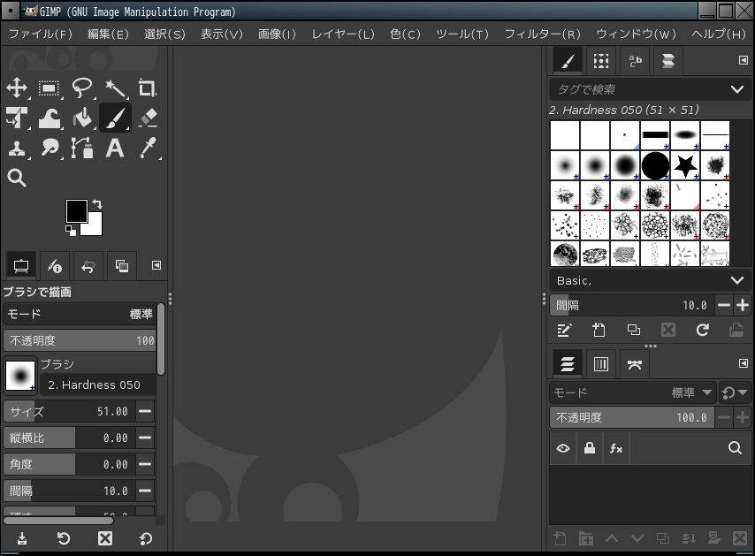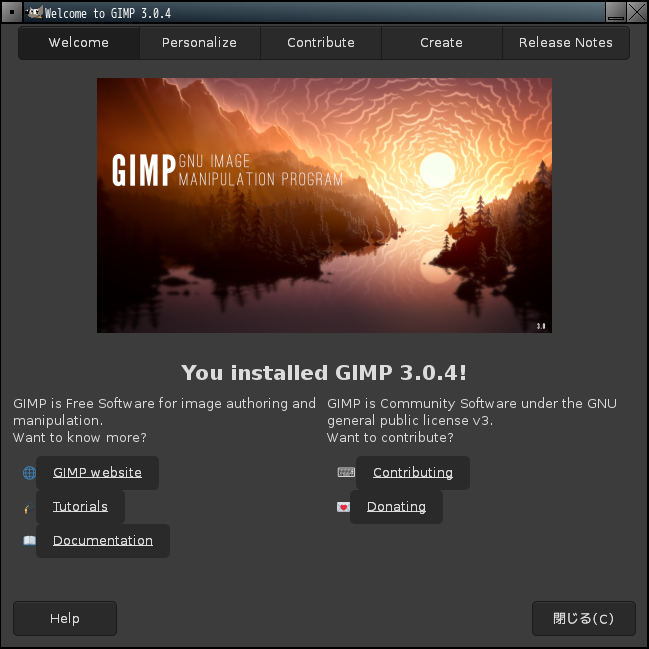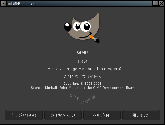 「閉じる」 起動後の状態です。 2025年12月15日の時点で、下記のバージョンでした。 操作については、「画像編集ソフト - GIMP」に掲載しています。 上記は簡単なものですので、詳細なものがほしい方は、各所に初歩の手引きから応用編までありますので、そちらを参考にしてください。 |