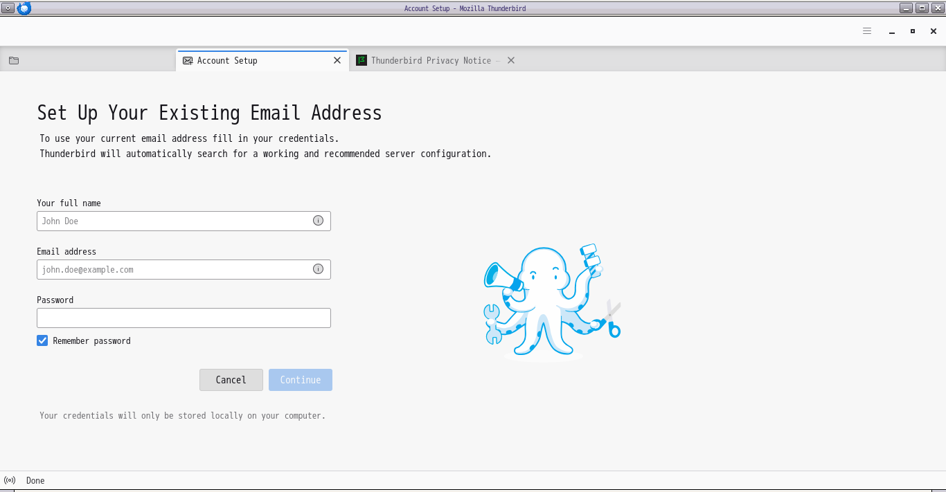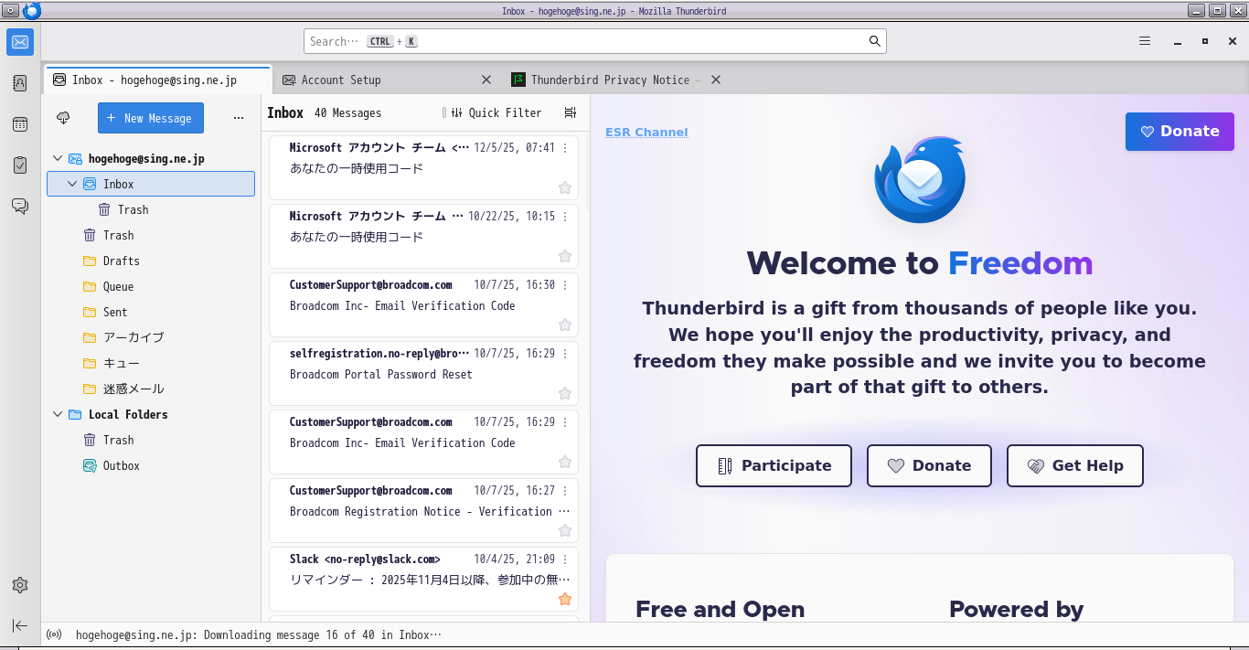 1. 概要 メールクライアントとして「Thunderbird」を使用します。 アカウント設定をはじめ、操作等については「メールクライアント - Thunderbird」をご参照ください。 2. インストール 「OctoPkg」で、「thunderbird」を検索して、インストールします。 3. 起動 「スタート」→「インターネット」→「Thunderbird」