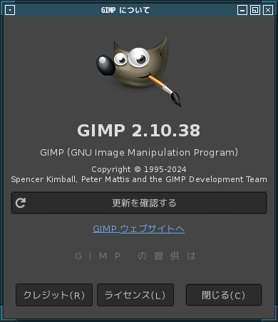 起動直後の状態です。 2024年10月7日の時点で、下記のバージョンでした。 操作については、「画像編集ソフト GIMP2」に掲載しています。 上記は簡単なものですので、詳細なものがほしい方は、各所に初歩の手引きから応用編までありますので、そちらを参考にしてください。 |