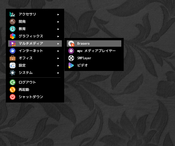 1. 概要 「Brasero」は、光学ディスク(CD・DVD)のライティングソフトです。 基本的な操作については「共通事項 - 光ディスクライティング」をご参照ください。 2. インストール 「OctoPkg」で、「brasero」を検索して、インストールします。 3. 起動 「デスクトップ上クリック」→「マルチメディア」→「Brasero」 起動できないことがあります。そういうときは、ログインしなおすことで、起動できるようになります。