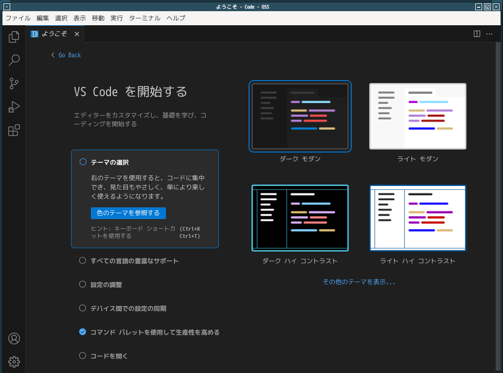 日本語化して、起動した直後の状態です。 2024年10月17日の時点で、下記のバージョンでした。 日本語化、他、「Visual Studio Code」の操作等については「統合開発環境 Visual Studio Code」をご参照ください。 |