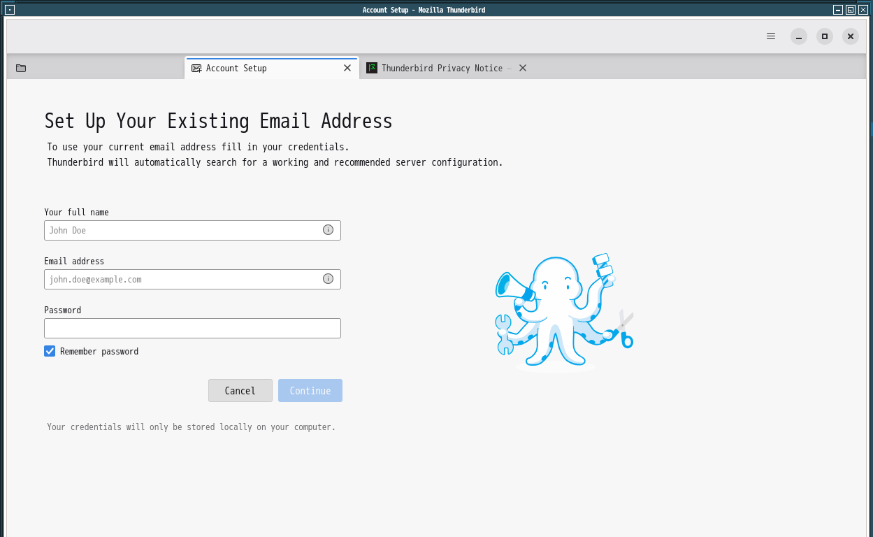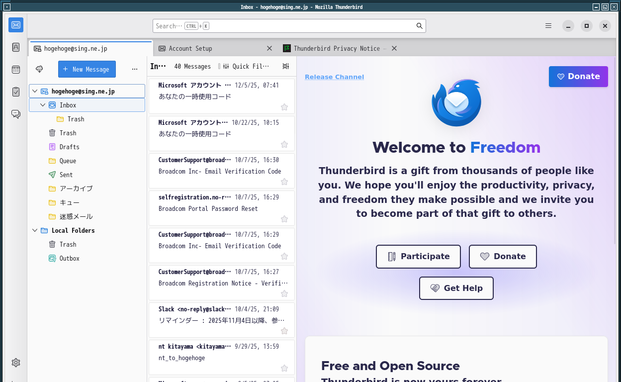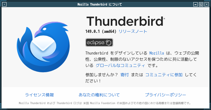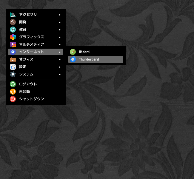 1. 概要 メールクライアントとして、「Thunderbird」を使用します。 アカウント設定をはじめ、操作等については「メールクライアント - Thunderbird」をご参照ください。 2. インストール 「OctoPkg」で、「thunderbird」を検索して、インストールします。 3. 起動 「デスクトップ上クリック」→「インターネット」→「Thunderbird」
