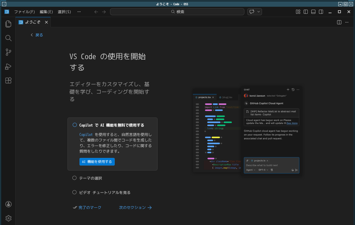 日本語化して、起動した直後の状態です。 2026年4月3日の時点で、下記のバージョンでした。 日本語化、他、「Visual Studio Code」の操作等については「統合開発環境 Visual Studio Code」をご参照ください。 |