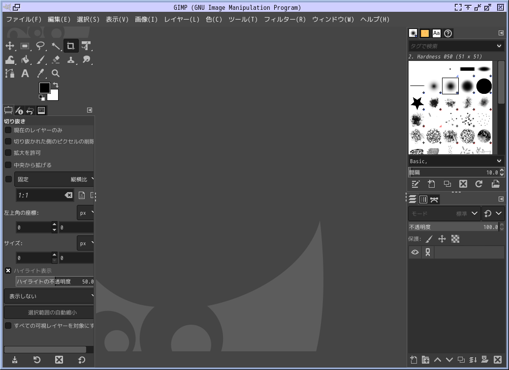 起動直後の状態です。 2024年10月10日の時点で、下記のバージョンでした。 操作については、「画像編集ソフト GIMP2」に掲載しています。 上記は簡単なものですので、詳細なものがほしい方は、各所に初歩の手引きから応用編までありますので、そちらを参考にしてください。 |
