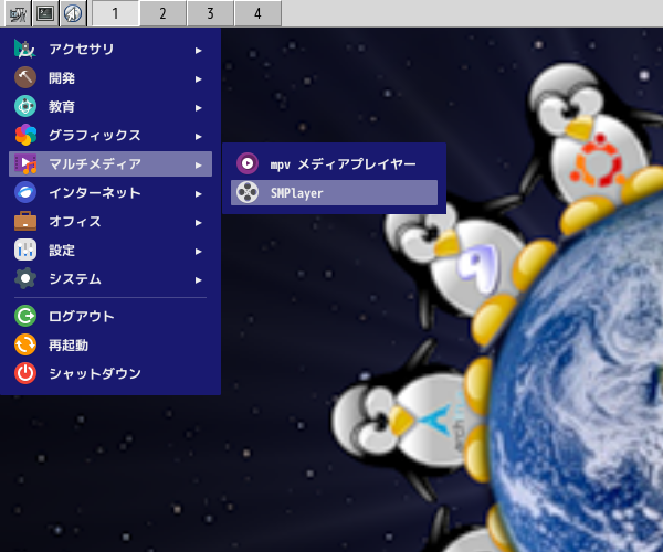 1. 概要 マルチメディアプレイヤーとして、「SMPlayer」を使用します。 2. インストール 「OctoPkg」で、「smplayer」を検索して、インストールします。 3. 起動 「スタート」→「マルチメディア」→「SMPlayer」