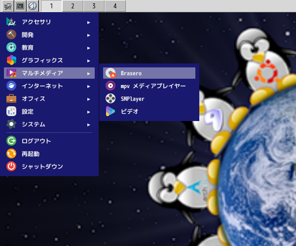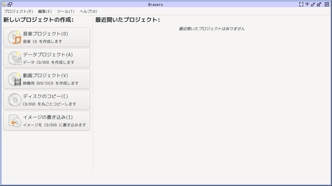 1. 概要 「Brasero」は、光学ディスク(CD・DVD)のライティングソフトです。 基本的な操作については「共通事項 - 光ディスクライティング」をご参照ください。 2. インストール 「OctoPkg」で、「brasero」を検索して、インストールします。 インストール直後に起動すると、こけて、起動できないことがあります。 そういうときは、ログインしなおしてください。そうすることで起動できるようになります。 3. 起動 「スタート」→「マルチメディア」→「Brasero」