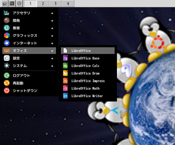 1. 概要 オフィススイートとして、「LibreOffice」を使用します。 2. インストール 「OctoPkg」で、「ja-libreoffice」を検索して、インストールします。 3. 起動 「スタート」→「オフィス」→「LibreOffice Start Center」