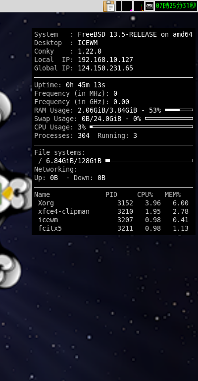 「インストール」「設定」「自動起動」の詳細に関しては、「共通事項 - タスクマネージャ Conky - FreeBSD の設定」の「FreeBSD 13.5 RELEASE」の項をご参照ください。