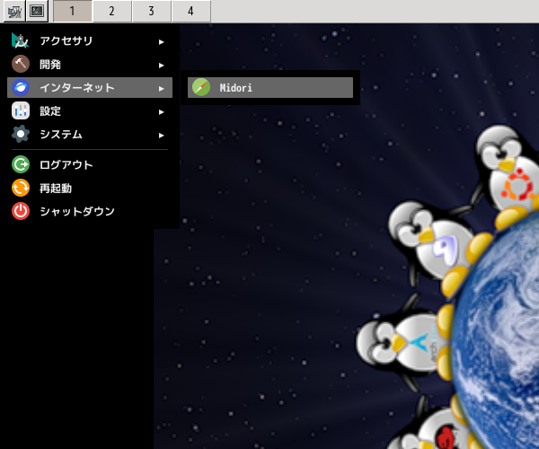 1. 概要 ブラウザとして、軽いので、「Midori」を使用します。 2. インストール 「OctoPkg」で、「midori」を検索して、インストールします。 3. 起動 「スタート」→「ネットワーク」→「Midori」