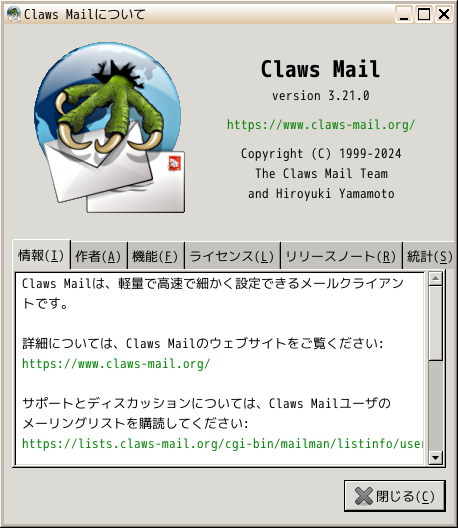 1. 概要 メールクライアントとして、「Claws Mail」を使用します。 「設定ウィザード」他、操作については「共通事項 - メールクライアント - Claws Mail」をご参照ください。 2. インストール 「OctoPkg」で、「claws-mail」を検索して、インストールします。 3. 起動 「スタート」→「ネットワーク」→「Claws Mail」