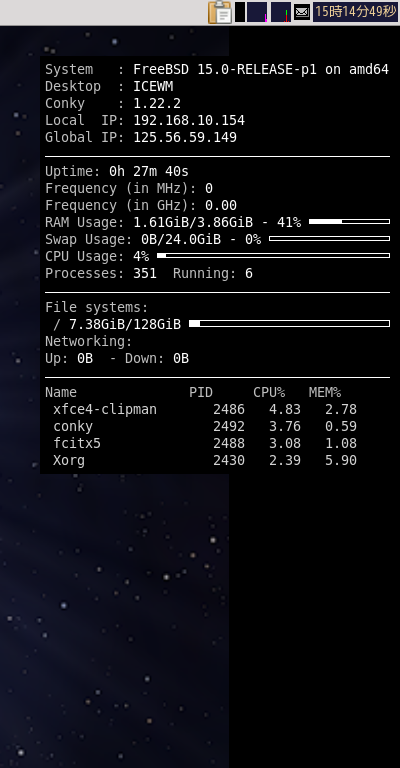 「インストール」「設定」「自動起動」の詳細に関しては、「共通事項 - タスクマネージャ Conky - FreeBSD の設定」の「FreeBSD 15.0 RELEASE」の項をご参照ください。