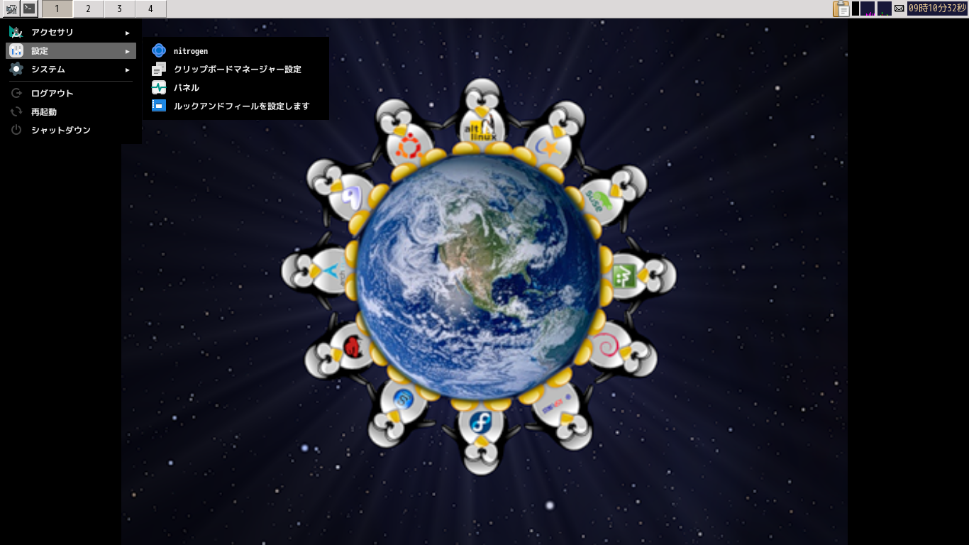 壁紙は、デフォルトインストール時に、設定されていなかったので、「nitrogen」をインストールして設定しました。 カスタマイズ後のデスクトップ・メニューです。 背景を「nitrogen」で描いて、「Zoomed」を設定したら、左右の端が見切れるけれども、サイズ感はピッタリになりました。 |