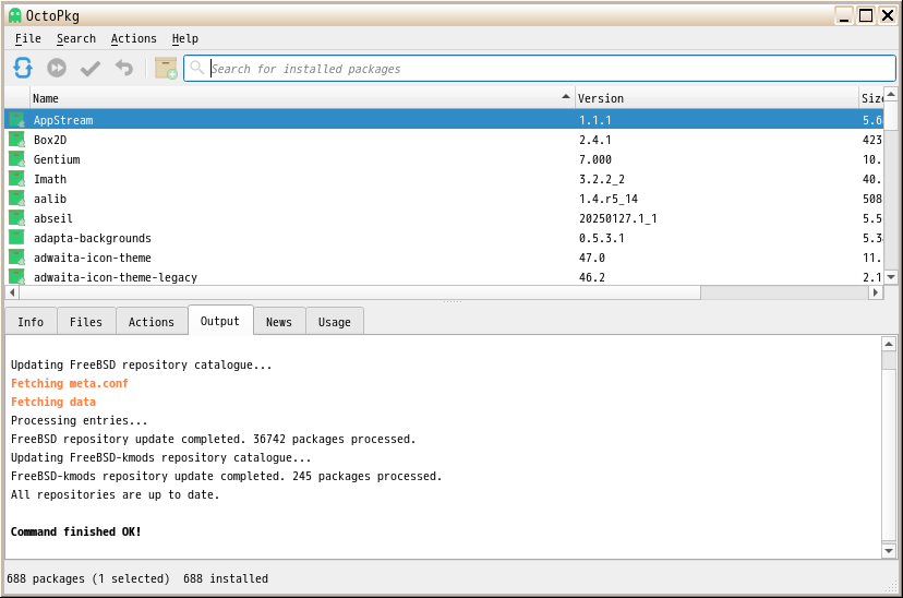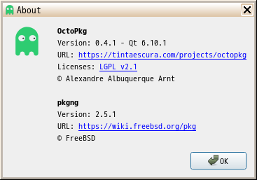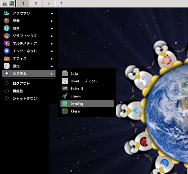 1. 概要 「OctoPkg」は、パッケージ管理(pkg)のグラフィカルフロントエンドです。 基本的な操作については共通事項の「パッケージ管理 OctoPkg」を参照してください。 2. インストール ここまでは、コマンドでインストールしなければならない。 「root」ユーザ権限で。 pkg install -y octopkg 3. 起動 「スタート」→「システム」→「OctoPkg」
