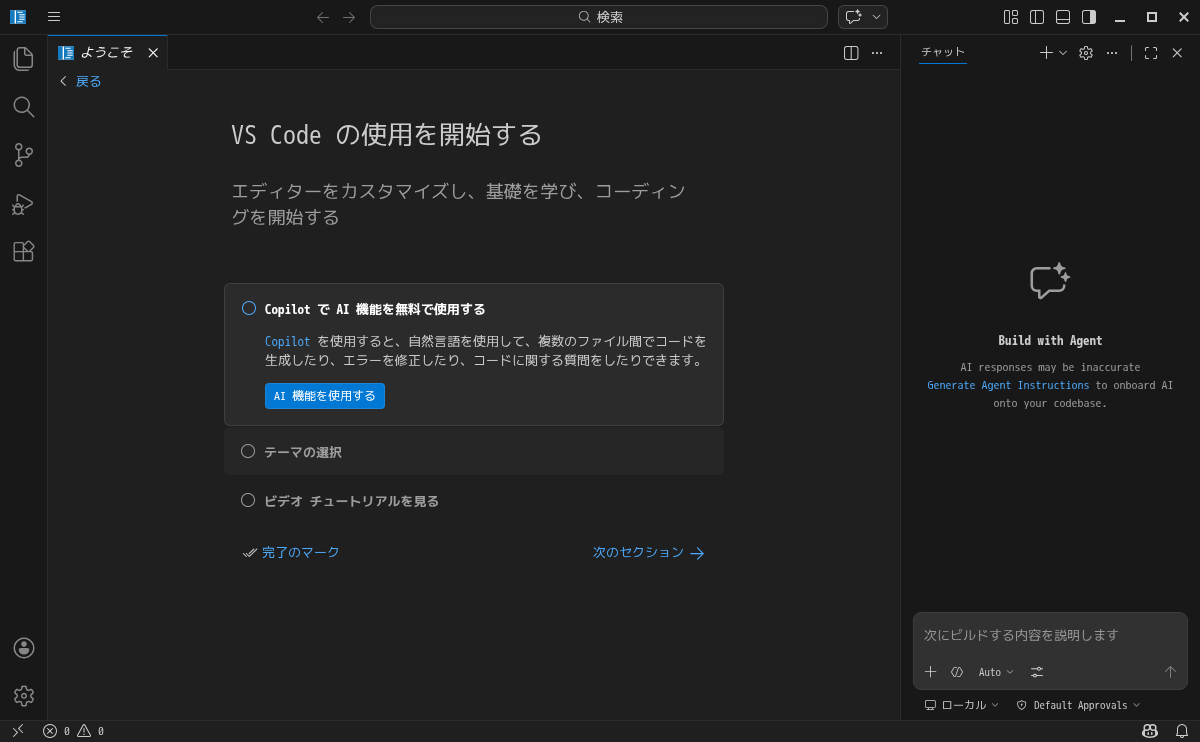 日本語化して、起動した直後の状態です。 2026年4月3日の時点で、下記のバージョンでした。 日本語化、他、「Visual Studio Code」の操作等については「統合開発環境 Visual Studio Code」をご参照ください。 |