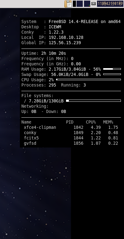 「インストール」「設定」「自動起動」の詳細に関しては、「共通事項 - タスクマネージャ Conky - FreeBSD の設定」の「FreeBSD 14.4 RELEASE」の項をご参照ください。
