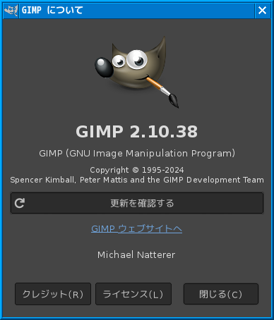 起動後の状態です。 2024年12月16日の時点で、下記のバージョンでした。 操作については、「画像編集ソフト GIMP2」に掲載しています。 上記は簡単なものですので、詳細なものがほしい方は、各所に初歩の手引きから応用編までありますので、そちらを参考にしてください。 |