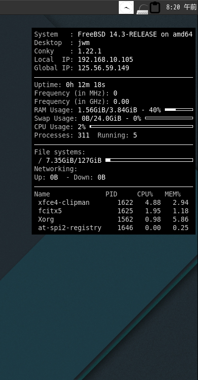 ログインしなおすと「Conky」が起動し、右端に下記のように表示されます。