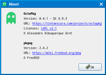1. 概要 「OctoPkg」は、パッケージ管理(pkg)のグラフィカルフロントエンドです。 基本的な操作については共通事項の「パッケージ管理 OctoPkg」を参照してください。 2. インストール 「root」ユーザ権限で。 pkg install -y octopkg 3. 起動 「スタート」→「システム」→「OctoPkg」