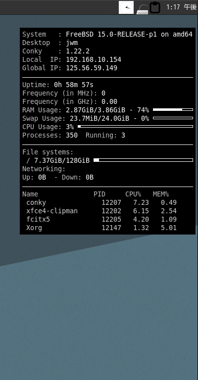 ログインしなおすと「Conky」が起動し、右端に下記のように表示されます。