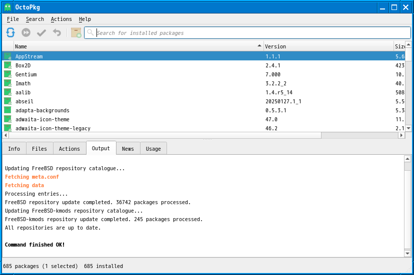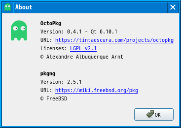 1. 概要 「OctoPkg」は、パッケージ管理(pkg)のグラフィカルフロントエンドです。 基本的な操作については共通事項の「パッケージ管理 OctoPkg」を参照してください。 2. インストール 「root」ユーザ権限で。 pkg install -y octopkg 3. 起動 「スタート」→「システム」→「OctoPkg」