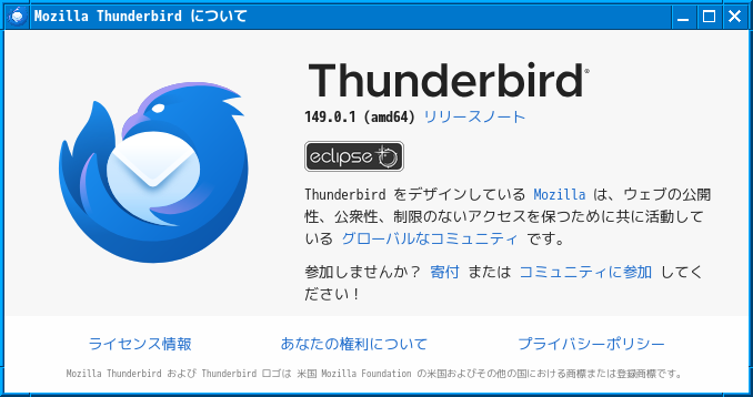 1. 概要 メールクライアントとして「Thuderbird」を使用します。 アカウント設定をはじめ、操作等については「メールクライアント - Thunderbird」をご参照ください。 2. インストール 「OctoPkg」で、「claws-mail」を検索して、インストールします。 3. 起動 「スタート」→「インターネット」→「Thuderbird」