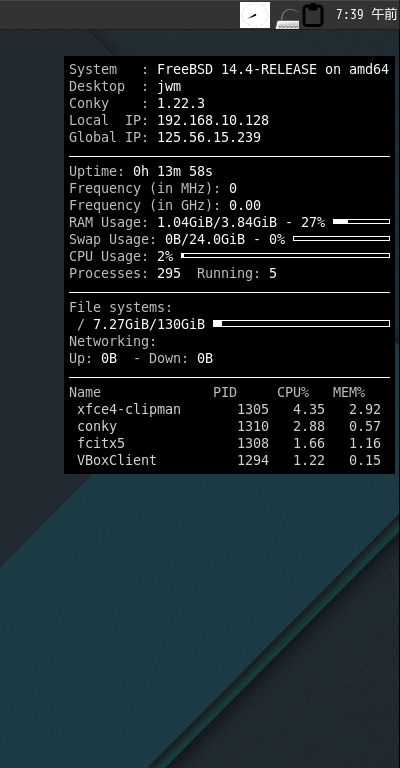 ログインしなおすと「Conky」が起動し、右端に下記のように表示されます。