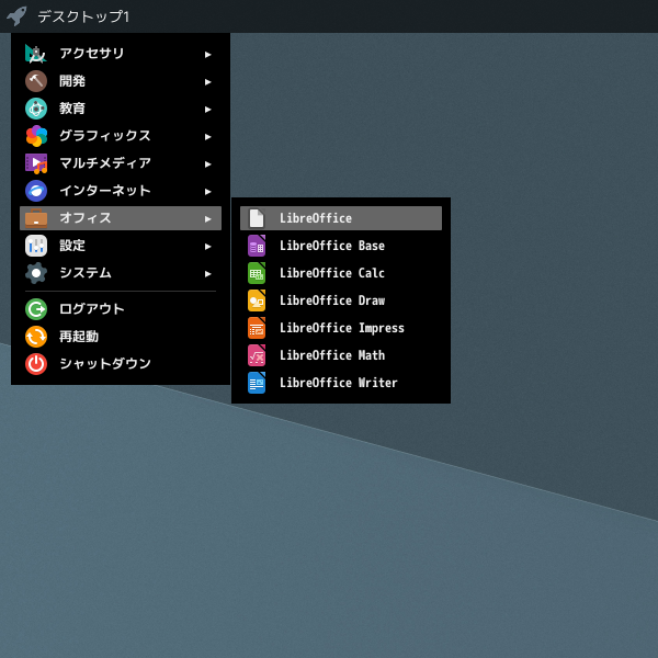 1. 概要 オフィススイートとして、「LibreOffice」を使用します。 2. インストール 「OctoPkg」で、「ja-libreoffice」を検索して、インストールします。 3. 起動 「スタート」→「オフィス」→「LibreOffice」