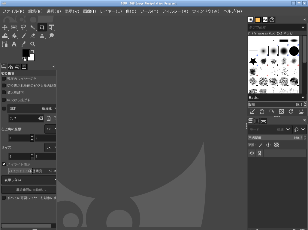 起動後の状態です。 2024年10月21日の時点で、下記のバージョンでした。 操作については、「画像編集ソフト GIMP2」に掲載しています。 上記は簡単なものですので、詳細なものがほしい方は、各所に初歩の手引きから応用編までありますので、そちらを参考にしてください。 |