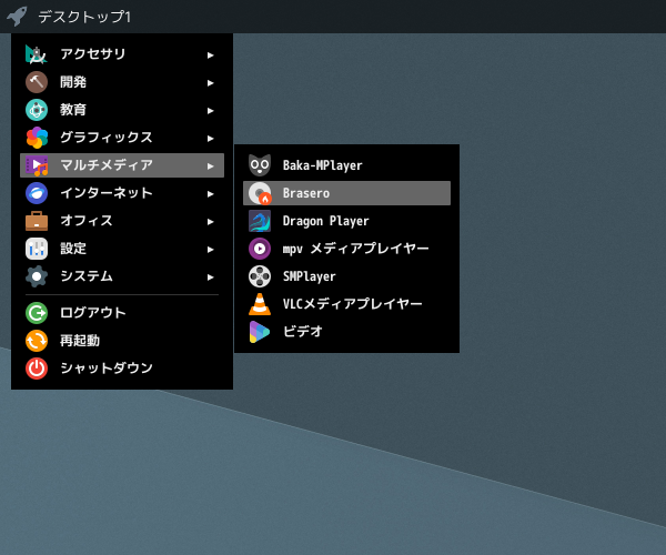 1. 概要 「Brasero」は、光学ディスク(CD・DVD)のライティングソフトです。 2. インストール 「OctoPkg」で、「brasero」を検索して、インストールします。 3. 起動 「スタート」→「マルチメディア」→「Brasero」