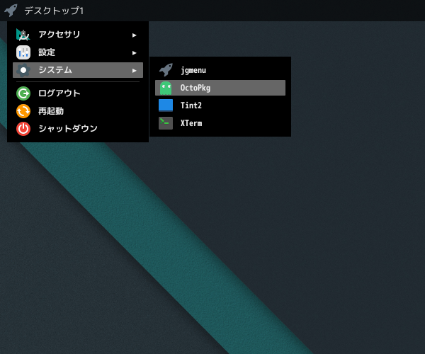 1. 概要 「OctoPkg」は、パッケージ管理(pkg)のグラフィカルフロントエンドです。 基本的な操作については共通事項の「パッケージ管理 OctoPkg」を参照してください。 2. インストール 「OctoPkg」自体は、コマンドでインストールします。 「root」ユーザ権限で。 pkg install -y octopkg 3. 起動 「スタート」→「システム」→「OctoPkg」
