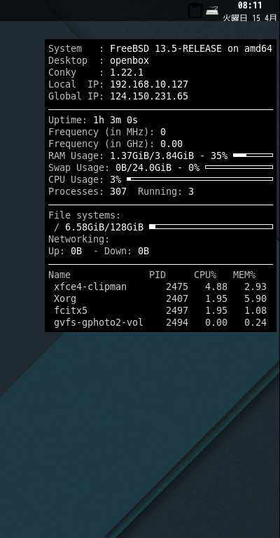 ログインしなおすと「Conky」が起動し、右端に下記のように表示されます。