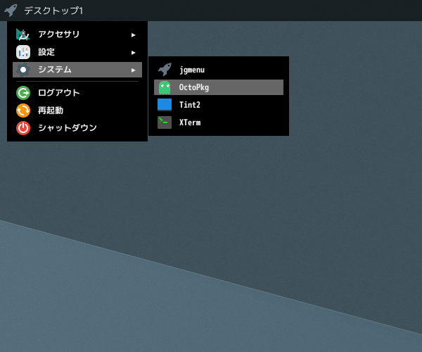 1. 概要 「OctoPkg」は、パッケージ管理(pkg)のグラフィカルフロントエンドです。 基本的な操作については共通事項の「パッケージ管理 OctoPkg」を参照してください。 2. インストール 「OctoPkg」自体は、コマンドでインストールします。 「root」ユーザ権限で。 pkg install -y octopkg 3. 起動 「スタート」→「システム」→「OctoPkg」