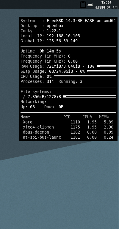 ログインしなおすと「Conky」が起動し、右端に下記のように表示されます。
