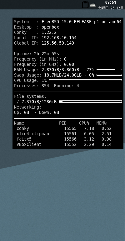 ログインしなおすと「Conky」が起動し、右端に下記のように表示されます。