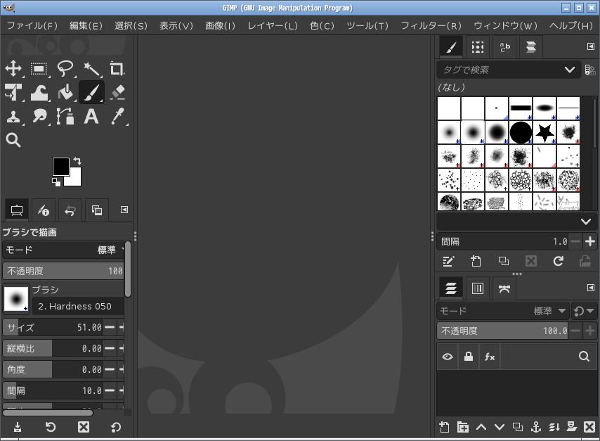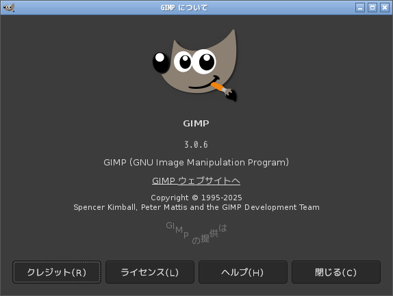 「閉じる」 起動後の状態です。 2026年4月6日の時点で、下記のバージョンでした。 操作については、「画像編集ソフト - GIMP」に掲載しています。 上記は簡単なものですので、詳細なものがほしい方は、各所に初歩の手引きから応用編までありますので、そちらを参考にしてください。 |