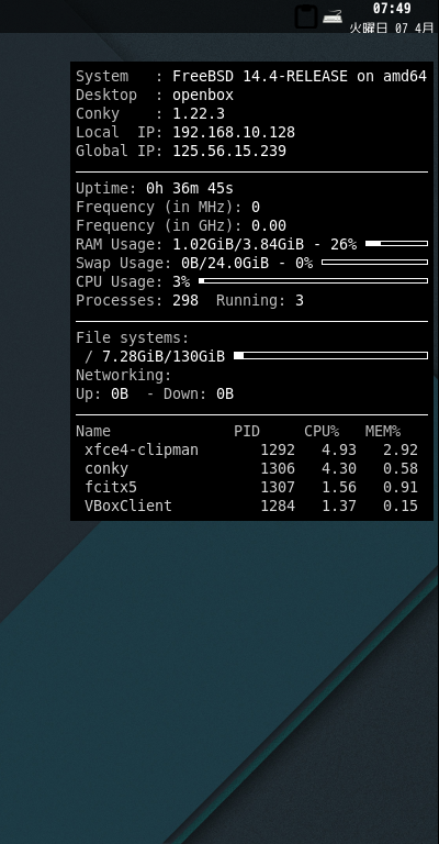 ログインしなおすと「Conky」が起動し、右端に下記のように表示されます。