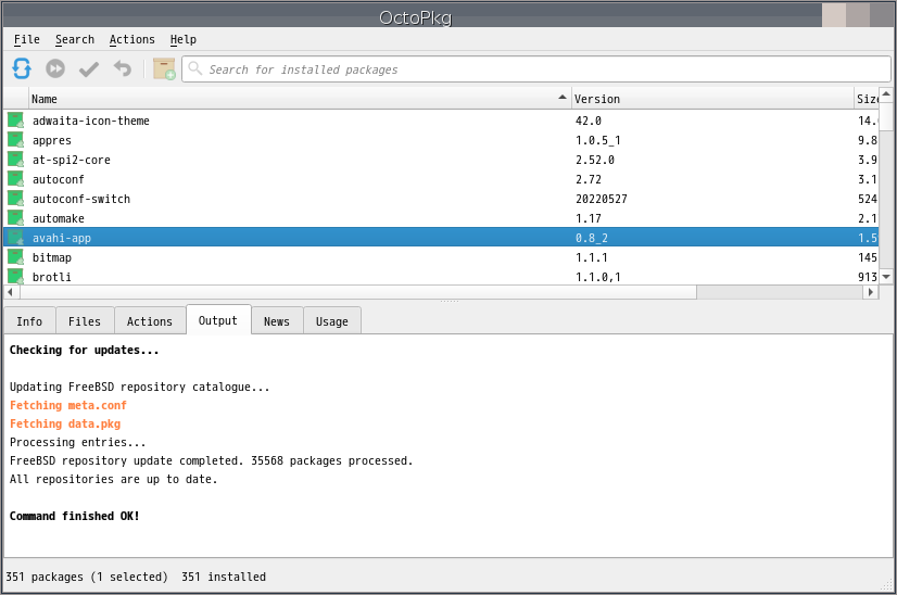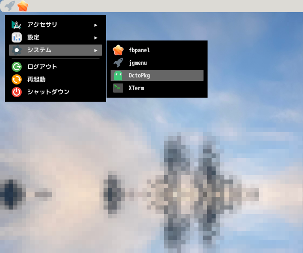 1. 概要 「OctoPkg」は、パッケージ管理(pkg)のグラフィカルフロントエンドです。 基本的な操作については共通事項の「パッケージ管理 OctoPkg」を参照してください。 2. インストール 「root」ユーザ権限で。 pkg install -y octopkg 3. 起動 「スタート」→「システム」→「OctoPkg」